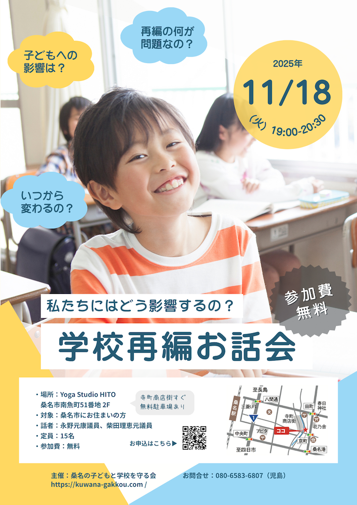 このホームページでは、桑名市の学校再編計画の内容だけでなく、全国の先行事例や、市民・先生・専門家の声などをご紹介し、学校再編についてより深く考えるきっかけになれればと思っています。