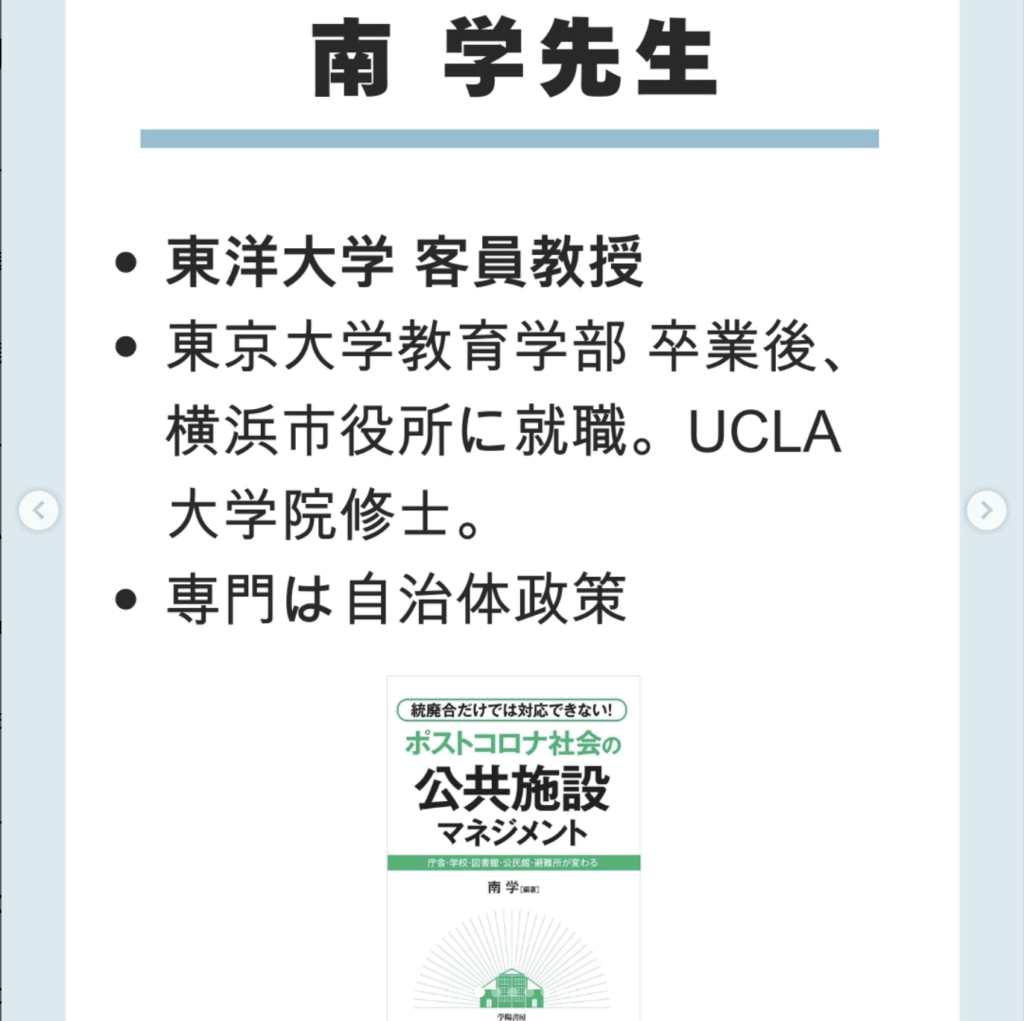 ---今回の参考書籍---・著者:南 学・書籍名:統廃合だけでは対応できない! ポストコロナ社会の公共施設マネジメント・出版社:学陽書房(2021年) 総務省主催の首長・管理者向けセミナーで講師をされている先生の本です。学校の統廃合を、公共施設の削減... -
