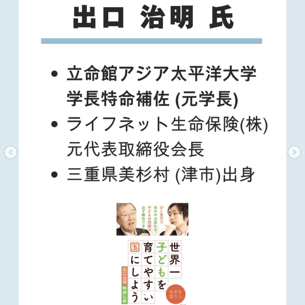 ---今回の参考書籍---・著者:出口治明、駒崎弘樹・書籍名:世界一子どもを育てやすい国にしよう・出版社:株式会社ウェッジ(2016年) 三重県生まれ、ライフネット生命創業者・元会長の出口さんと、「Newsweek」の“世界を変える100人の社会起業家”に選出... -