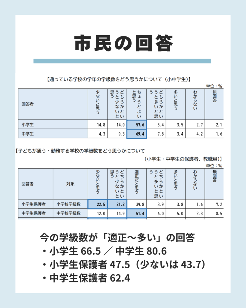 市の主張:市民アンケートで「1学年2〜3学級」の回答が多かったから