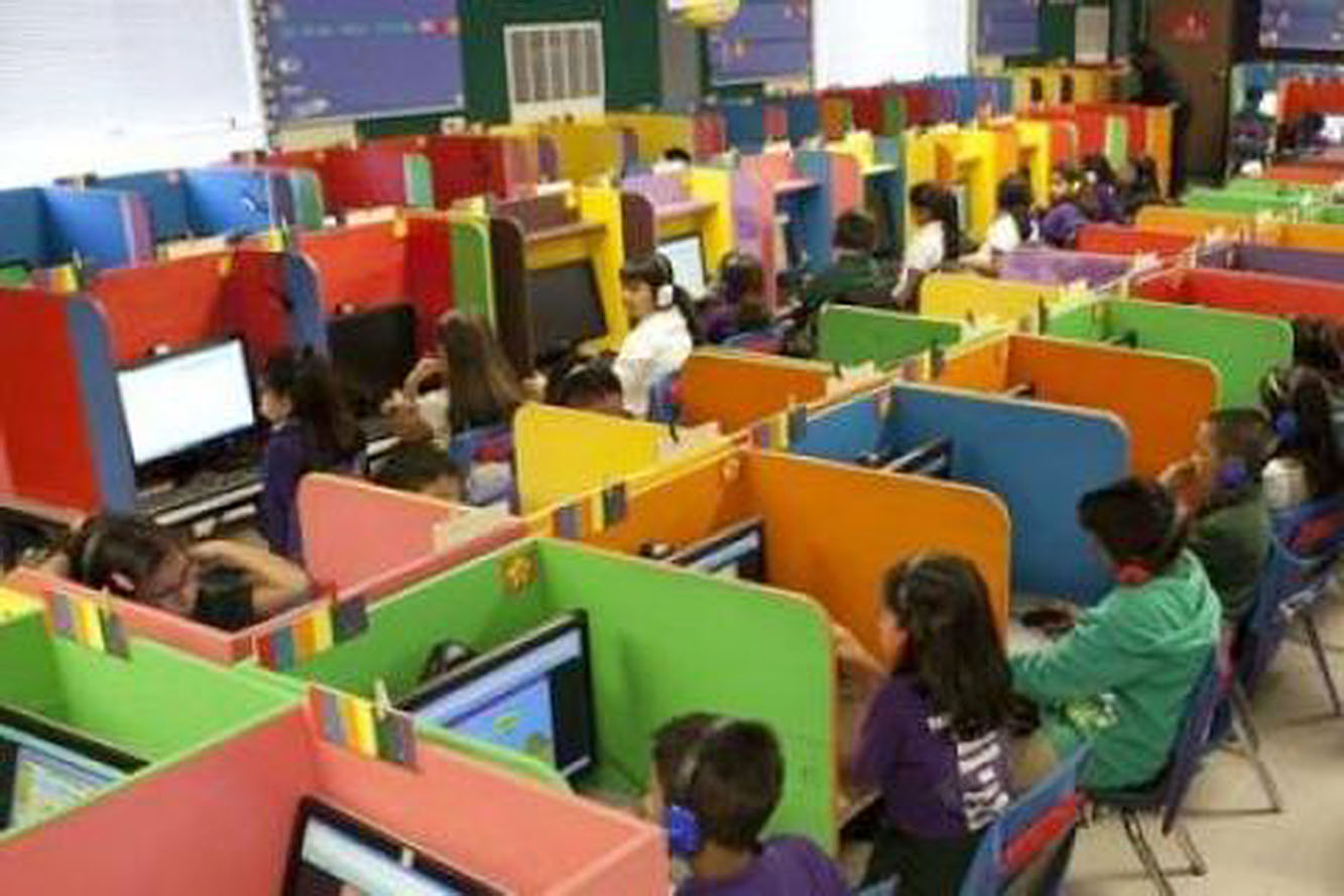写真は、最大150人の子どもたちがPCで学習する、アメリカの公設民営学校の様子です。先生ではなく、アルバイトが時給$15で子どもたちを監督しています。(参照:「新自由主義と公教育の危機 教育研究者・鈴木大裕」長周新聞)